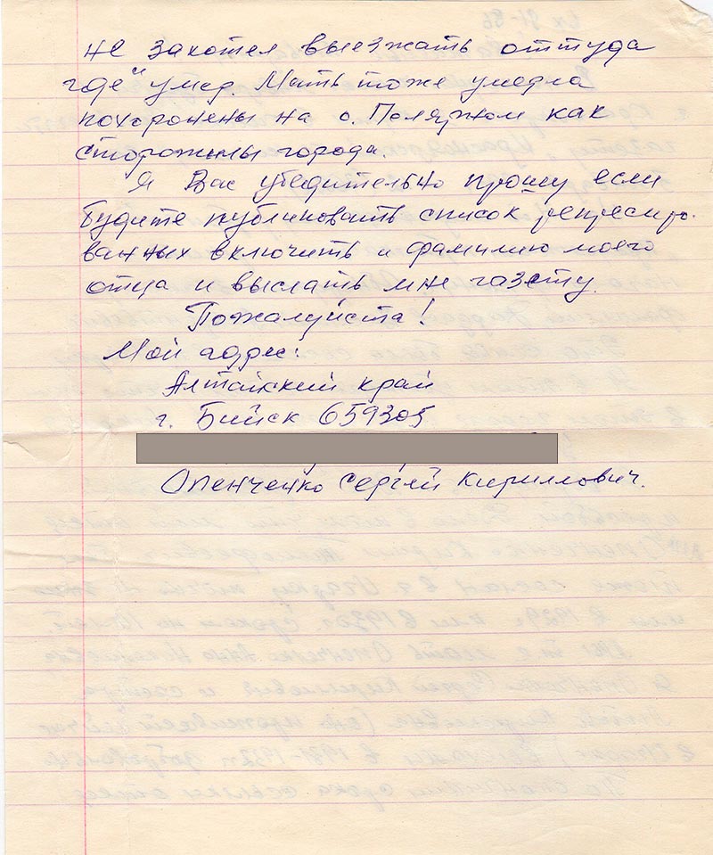 Мы т.е. мать Опенченко Анна Николаевна, я Опенченко Сергей Кириллович и сестра Любовь Кирилловна (она проживает сейчас в Игарке) выехали в 1931-1932 гг. добровольно.