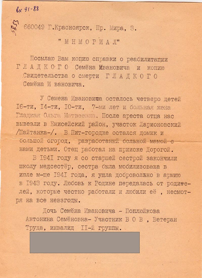 жена Гладкая Ольга Матвеевна. После ареста отца нас вывезли в Енисейский район,