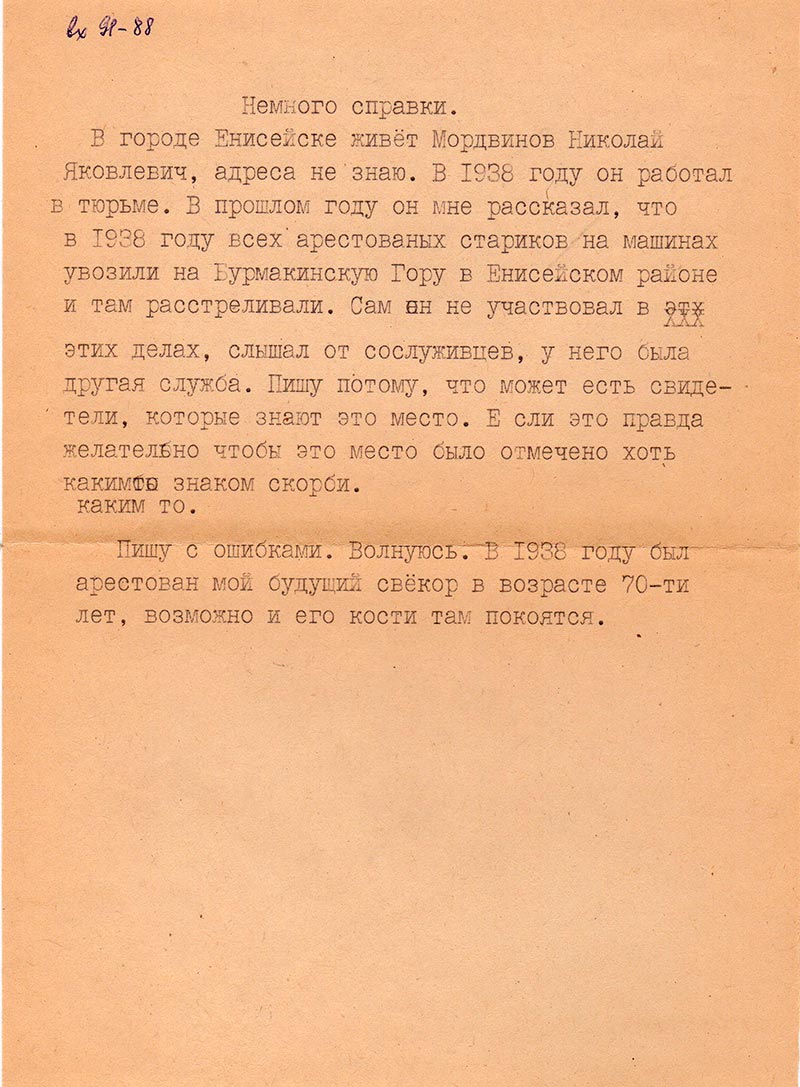 В городе Енисейске живет Мордвинов Николай Яковлевич, адреса не знаю. В 1938 году он работал в тюрьме. В прошлом году он мне рассказал, что в 1938 году всех арестованных стариков на машинах увозили на Бурмакинскую Гору в Енисейском районе и там расстреливали. Сам он не участвовал в этих делах, слышал от сослуживцев, у него была другая служба. Пишу потому, что может есть свидетели, которые знают это место. Если это правда желательно чтобы это место было отмечено хоть каким-то знаком скорби.