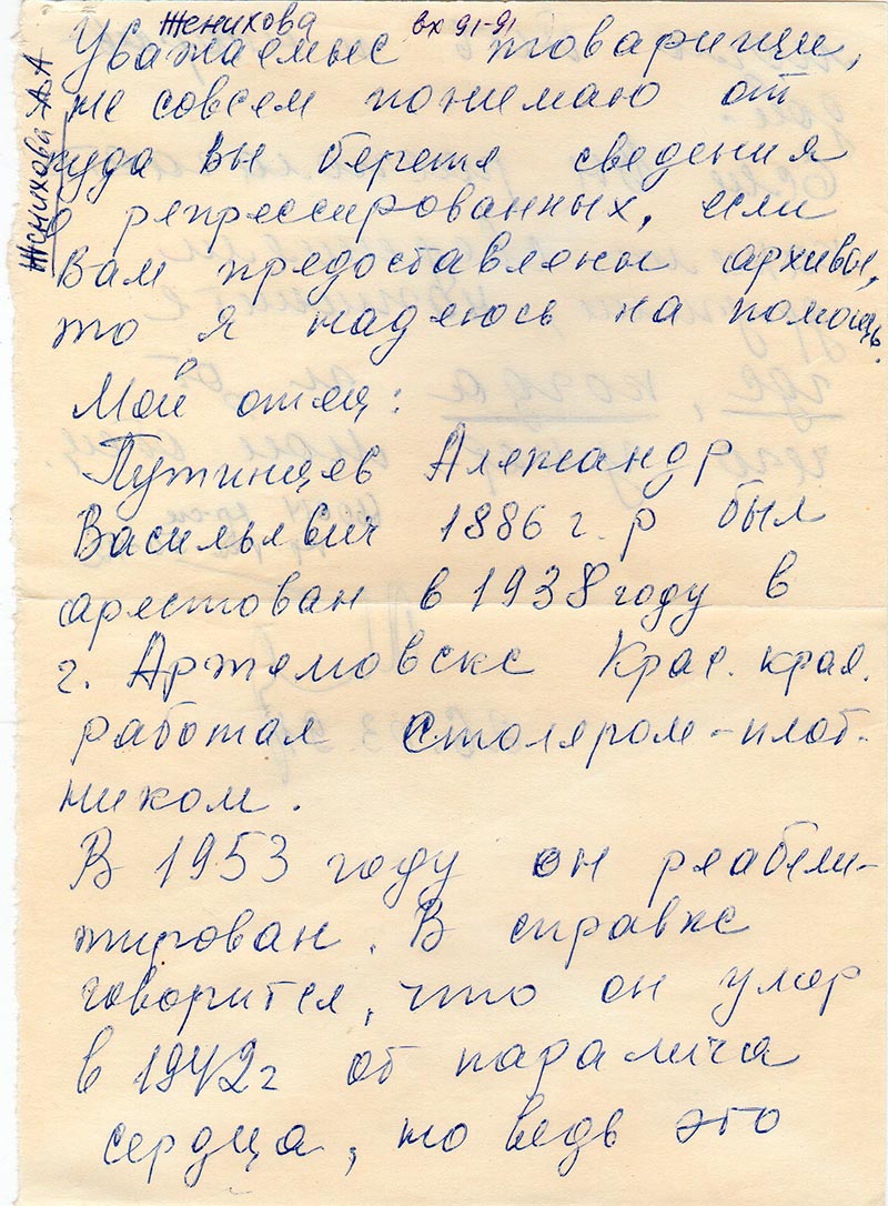 Путинцев Александр Васильевич 1886 г.р. был арестован в 1938 году в г. Артемовск Крас. Края. Работал столяром-плотником.