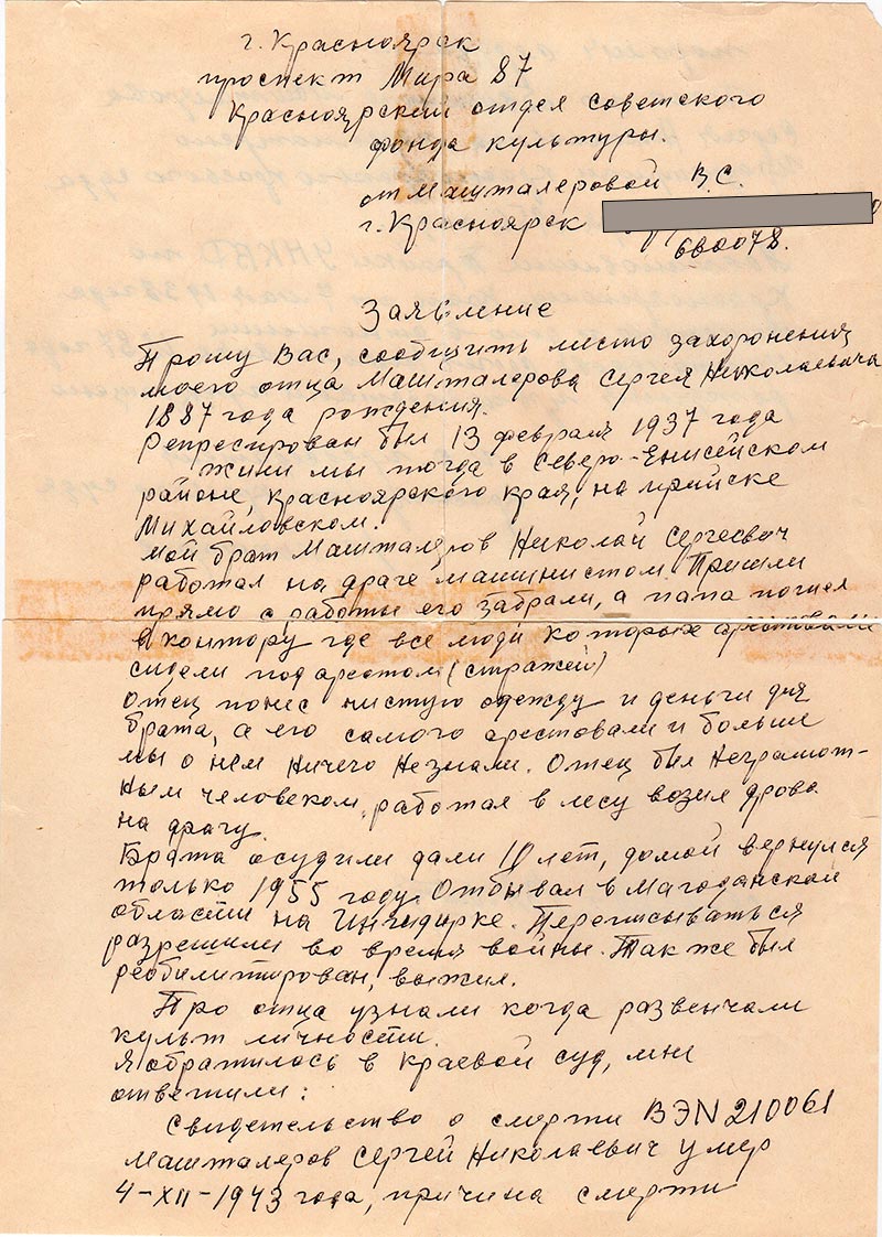 Прошу Вас сообщить место захоронения моего отца Машталерова Сергея Николаевича 1887 года рождения.