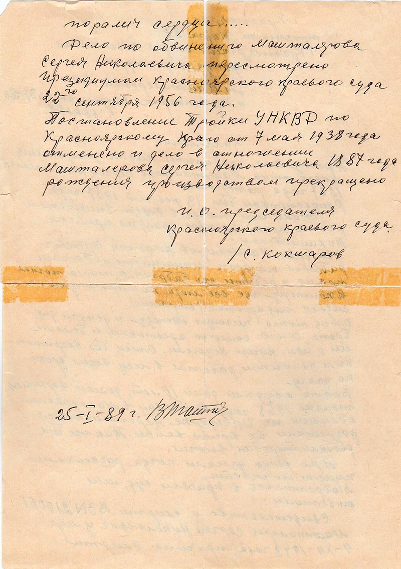 Постановление Тройки УНКВД по Красноярскому краю от 7 мая 1938 года отменено и