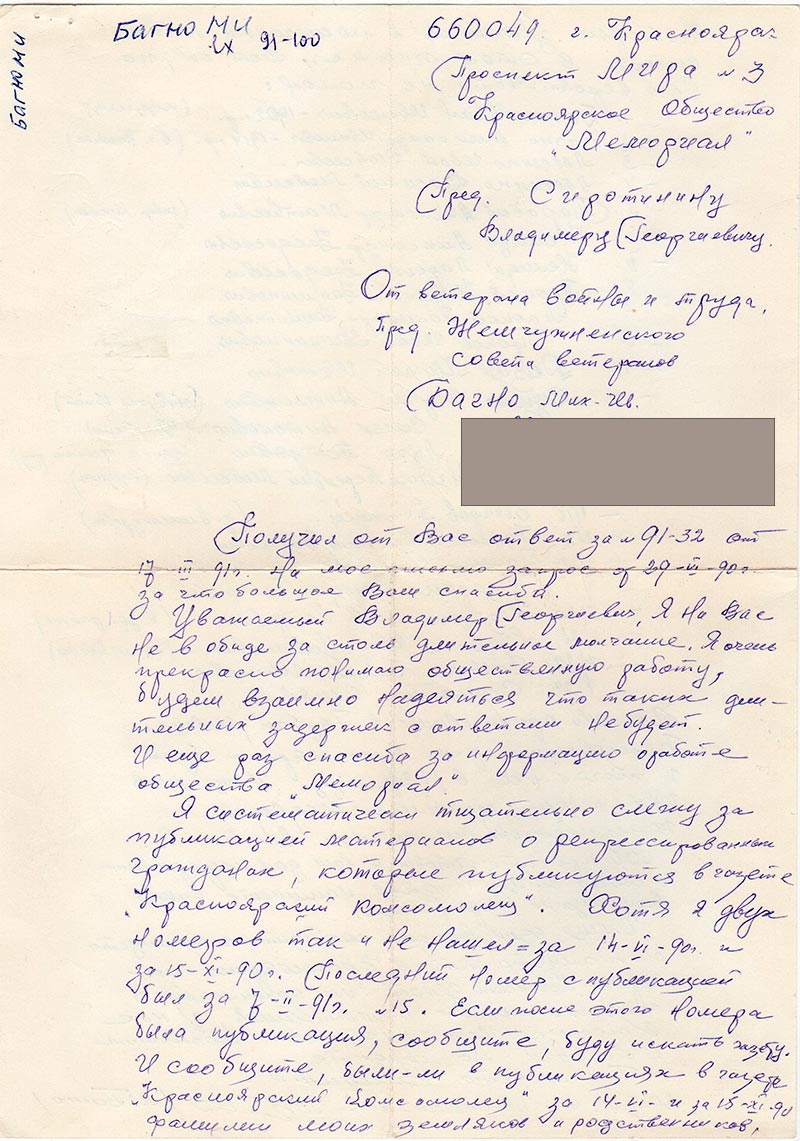 Я систематически тщательно слежу за публикацией материалов о репрессированных граждан, которые публикуются в газете «Красноярский комсомолец». Хотя я двух номеров так и не нашел - за 14-VI-90г. и за 15-XI-90 г. Последний номер с публикацией был за 7-II-91 г. № 15. Если после этого номера была публикация, сообщите, буду искать газету.