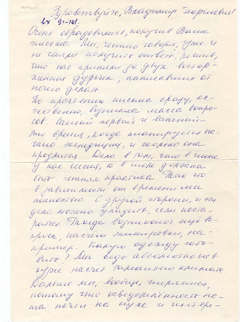 Очень обрадовались, получив Ваше письмо. Мы, честно говоря, уже и не чаяли получить ответ, решив, что нас приняли за двух восторженных дурочек, написавших от нечего делать.