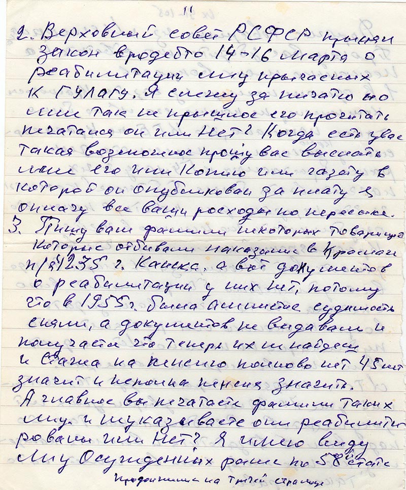 2. Верховный совет РСФСР прынял закон вродебто 14-16 марта о реабилитации лиц прычасных к ГУЛВГУ. Я слкжу за пичатю но мне так не прышлос его прочитать печатался он или нет? Когда есть у вас такая возможность прошу вас выслать мне его или копию, или газету в которой он опубликован за плату я оплачу ваши расходы по пересылке.