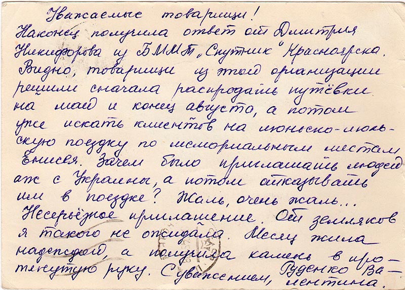 Наконец получила ответ от Дмитрия Никифорова из БММТ «Спутник» Красноярска. Видно, товарищи из этой организации решили сначала распродать путёвки на май и конец августа, а потом уже искать клиентов на июньско-июльскую поездку по мемориальным местам Енисея. Зачем было приглашать людей аж с Украины, а потом отказывать им в поездке? Жаль, очень жаль…