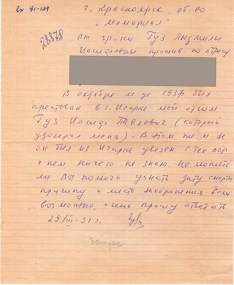 В октябре м-це 1937 г. был арестован в г. Игарке мой отчим Гуз Иосиф Павлович
