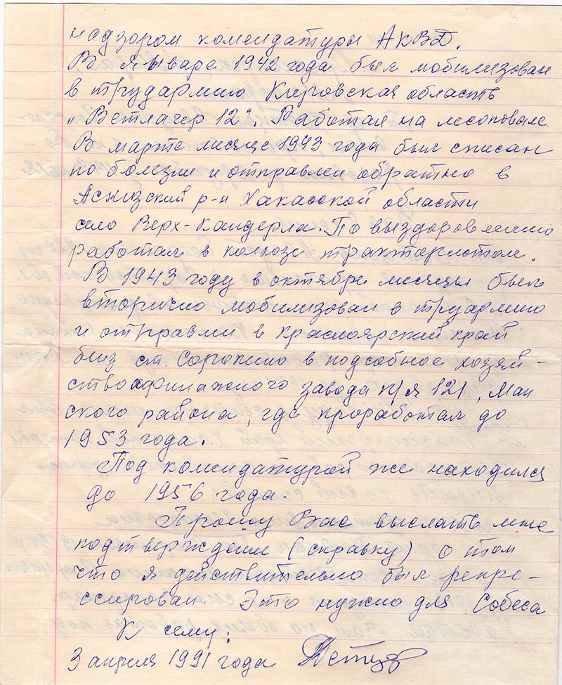 В 1943 году в октябре месяце был вторично мобилизован в трудармию и отправлен в Красноярский край близ ст. Сорокино в подсобное хозяйство афинажного завода п/я 121, Майского района, где проработал до 1953 года.