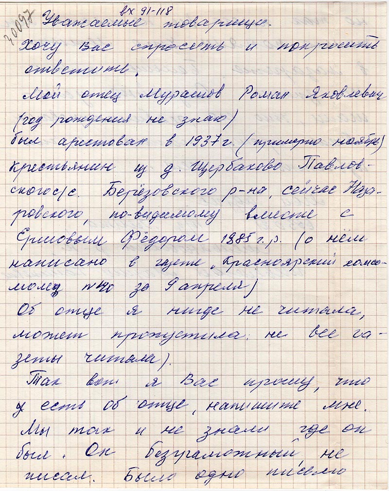 Мой отец Мурашов Роман Яковлевич (год рождения не знаю) был арестован в 1937 г. (примерно ноябрь) крестьянин из д. Щербаково Павловского с/с Березовского р-на, сейчас Назаровского, по-видимому вместе с Ершовым Федором 1885 г.р. (о нем написано в газете «Красноярский комсомолец» №40 за 9 апреля).