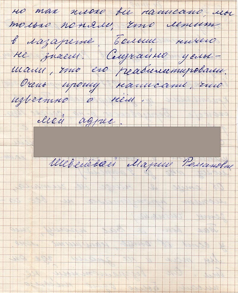 Так вот я Вас прошу, что есть об отце, напишите мне. Мы так и не знали где он был. Он безграмотный, не писал. Было одно письмо