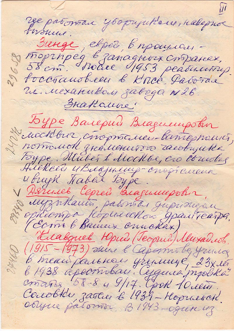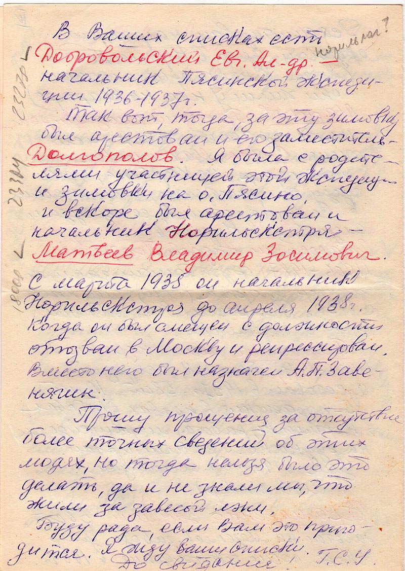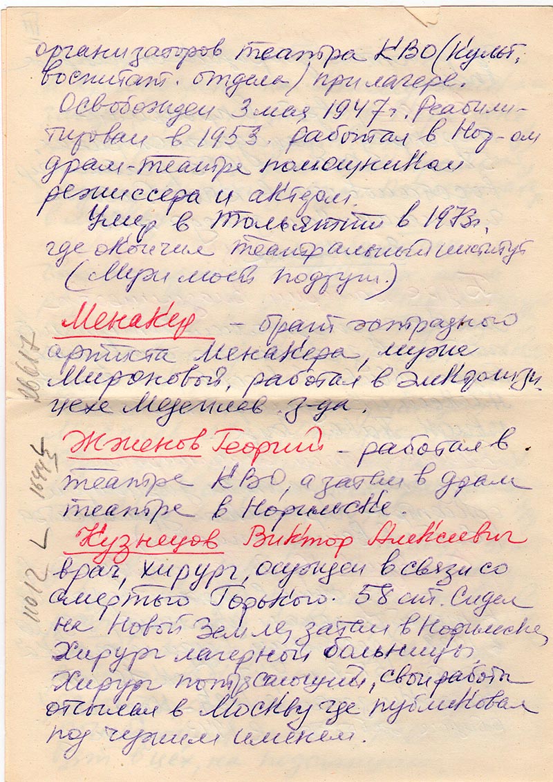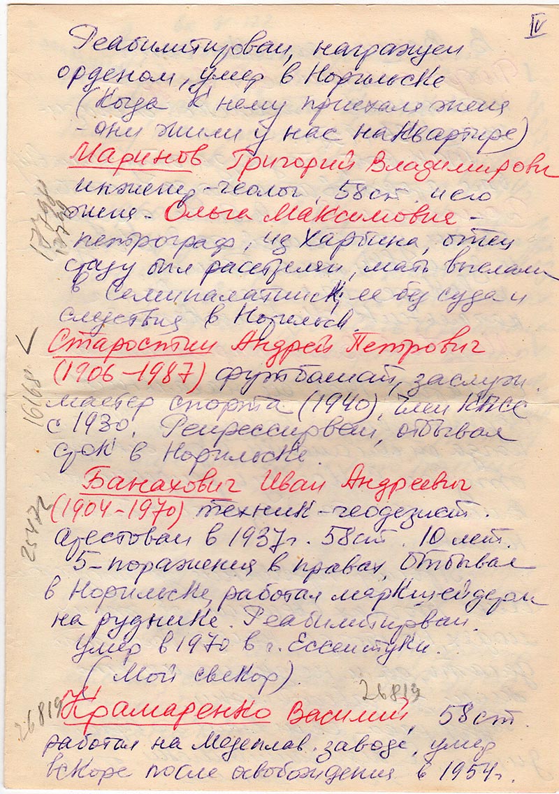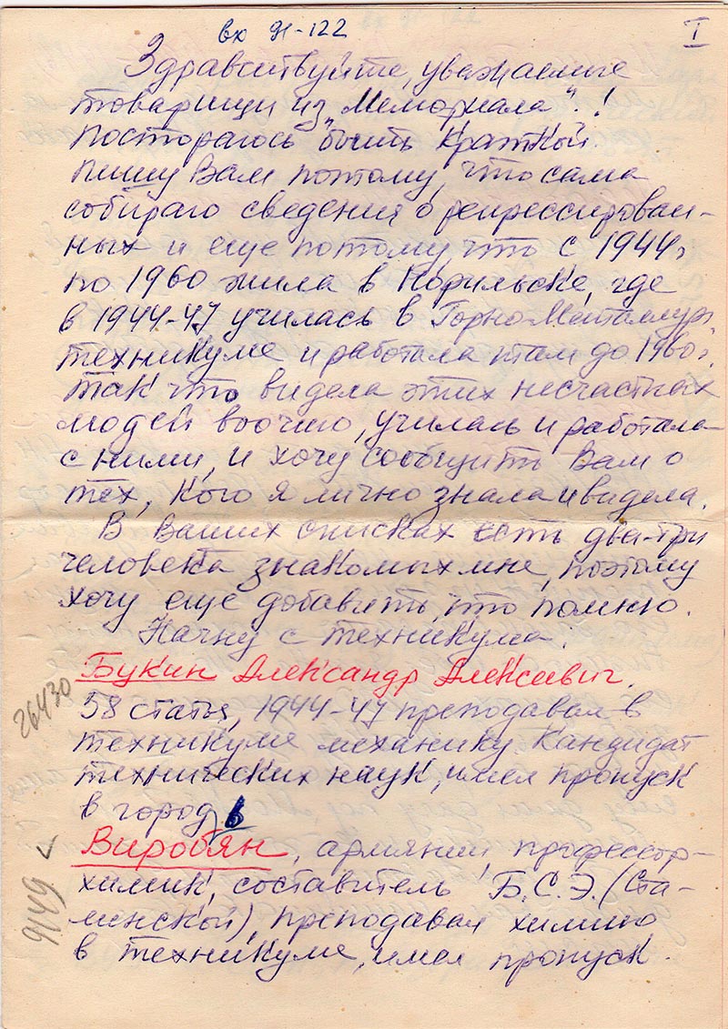 Здравствуйте, уважаемые товарищи из «Мемориала»! Постораюсь быть краткой. Пишу Вам потому, что сама собираю сведения о репрессированных и еще потому, что с 1944 г. по 1960 жила в Норильске, где в 1944-47 училась в Горно-Металлург. техникуме и работала там до 1960 г. Так что видела этих несчастных людей воочию, училась и работала с ними, и хочу сообщить Вам о тех, кого я лично знала и видела.