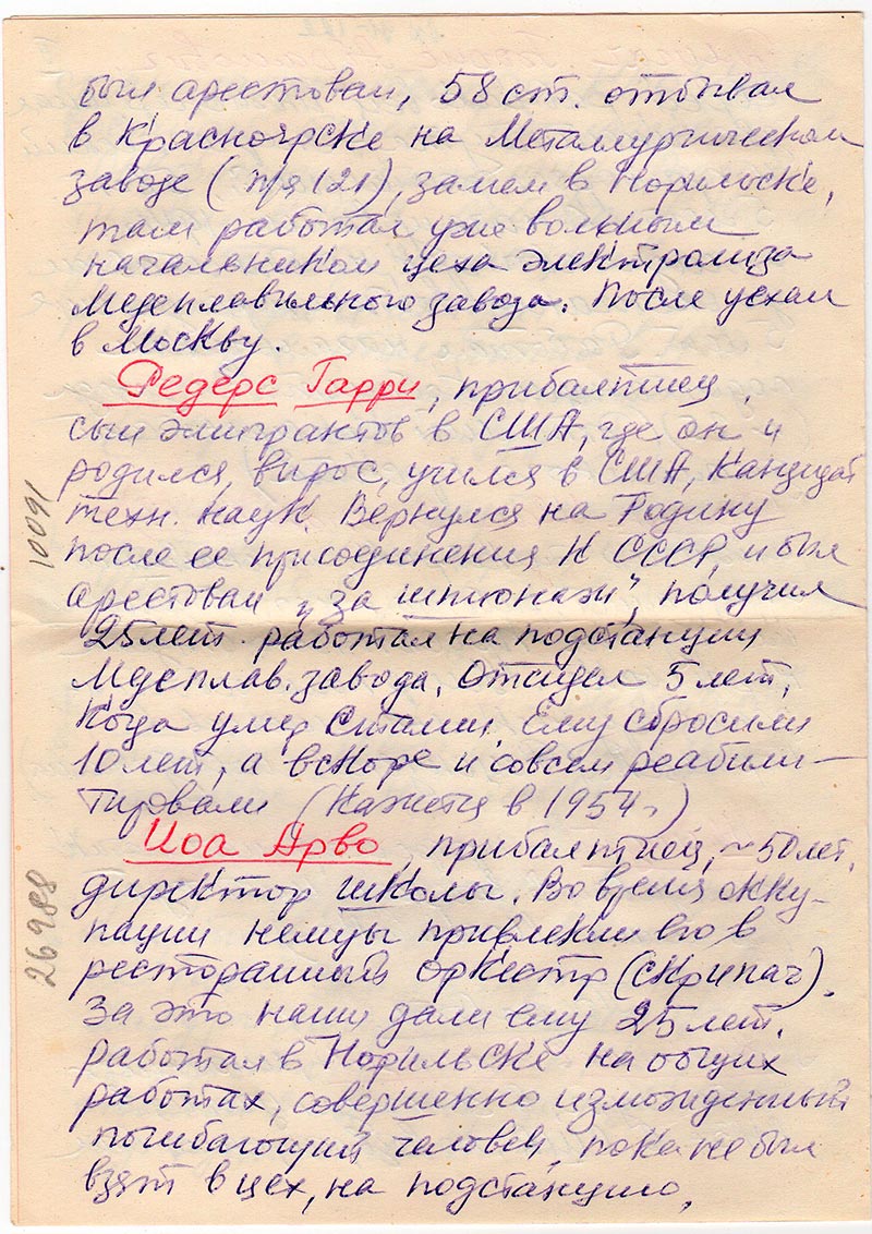 Иоа Арво, прибалтиец, ~50 лет, директор школы. Во время оккупации немцы привлекли его в ресторанный оркестр (скрипач). За это наши дали ему 25 лет. Работал в Норильске на общих работах, совершенно изможденный погибающий человек, пока не был взят в цех, на подстанцию, где работал уборщиком, наверное выжил. Комментарий: (*26988)