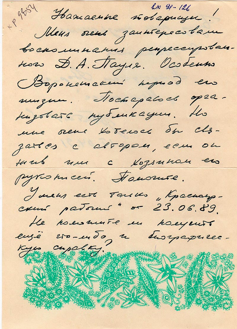 Меня очень заинтересовали воспоминания репрессированного Д.А. Пауля. Особенно Воронежский период его жизни. Постараюсь организовать публикации. Но мне очень хотелось бы связаться с автором, если он жив или с хозяином его рукописей. Помогите.