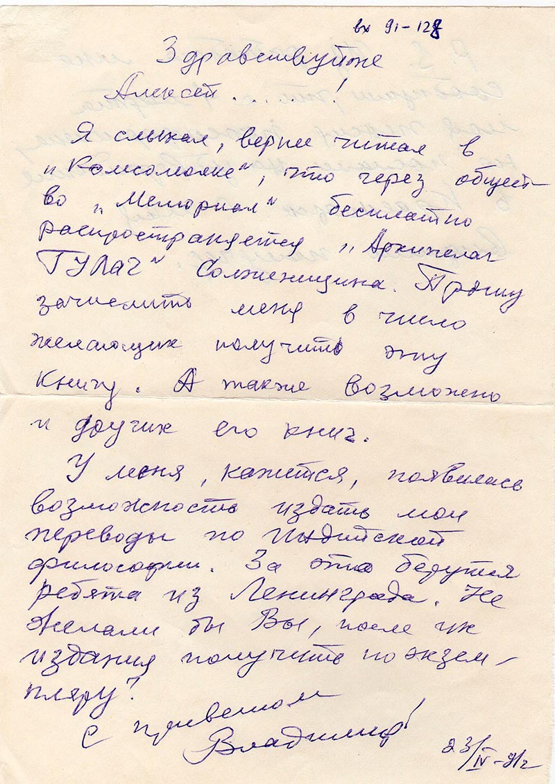 Я слыхал, вернее читал в «Комсомолке», что через общество «Мемориал» бесплатно распространяется «Архипелаг ГУЛАГ» Солженицина. Прошу зачислить меня в число желающих получить эту книгу. А также возможно и других его книг.