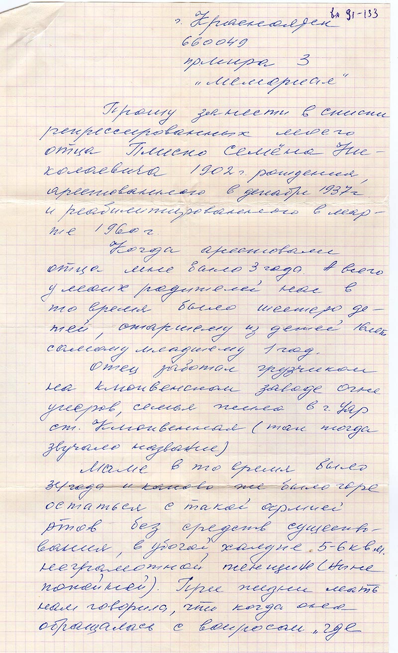 Прошу занести в списки репрессированных моего отца Плиско Семёна Николаевича 1902 г. рождения, арестованного в декабре 1937 г. и реабилитированного в марте 1960 г.