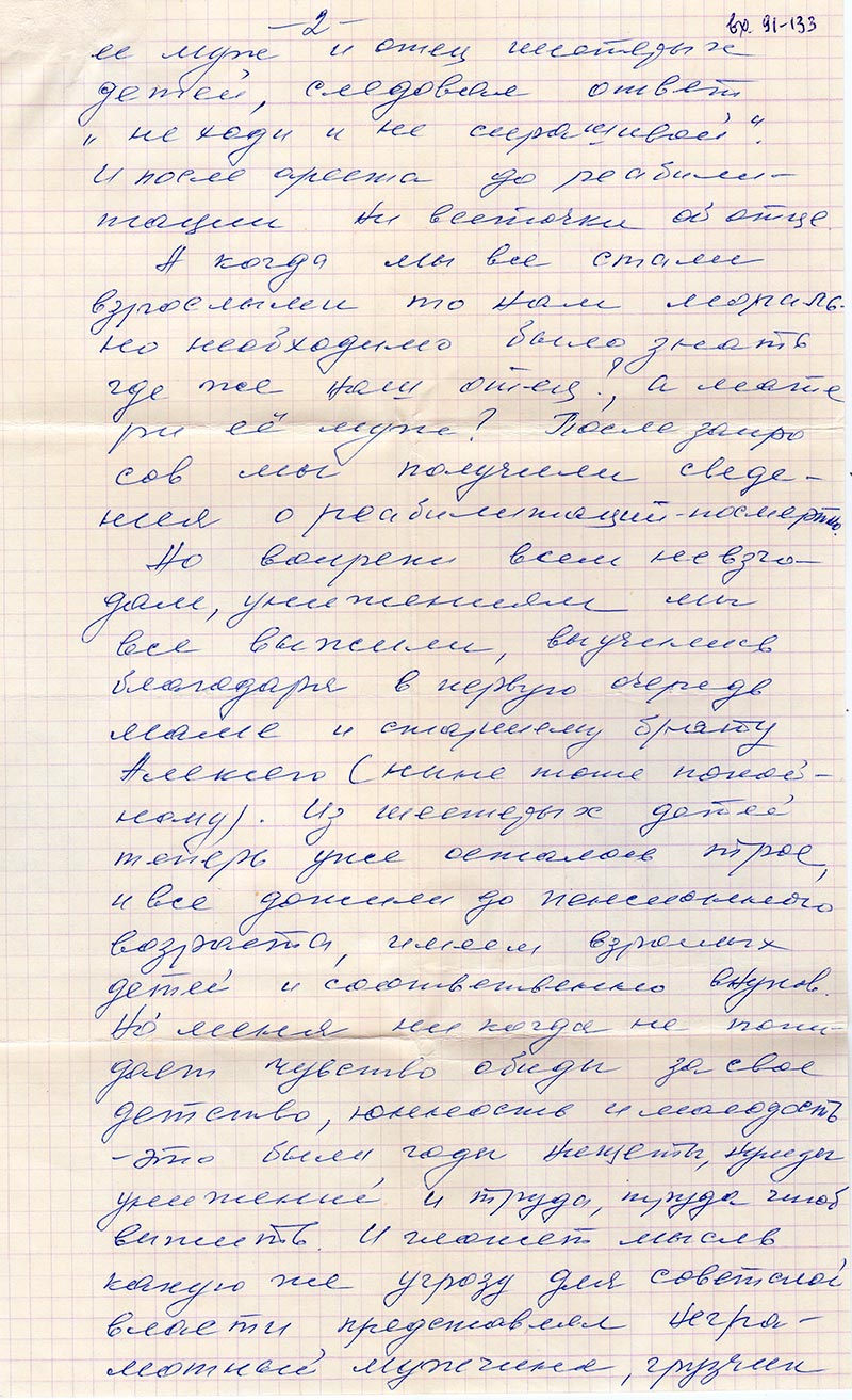А когда мы все стали взрослыми то нам морально необходимо было знать где же наш отец?а матери её муж? После запросов мы получили сведения о реабилитации посмертно.