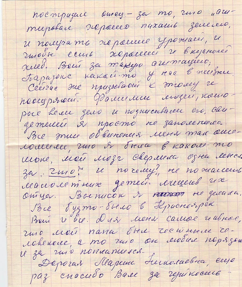 Познакомили меня с делом в Канске. Из дела я узнала за что пострадал отец – за то, что «агитировал хорошо пахать землю, и получать хороший урожай, и чтобы есть хороший и вкусный хлеб». Вот за такую агитацию. Парадокс какой-то у нас в жизни.