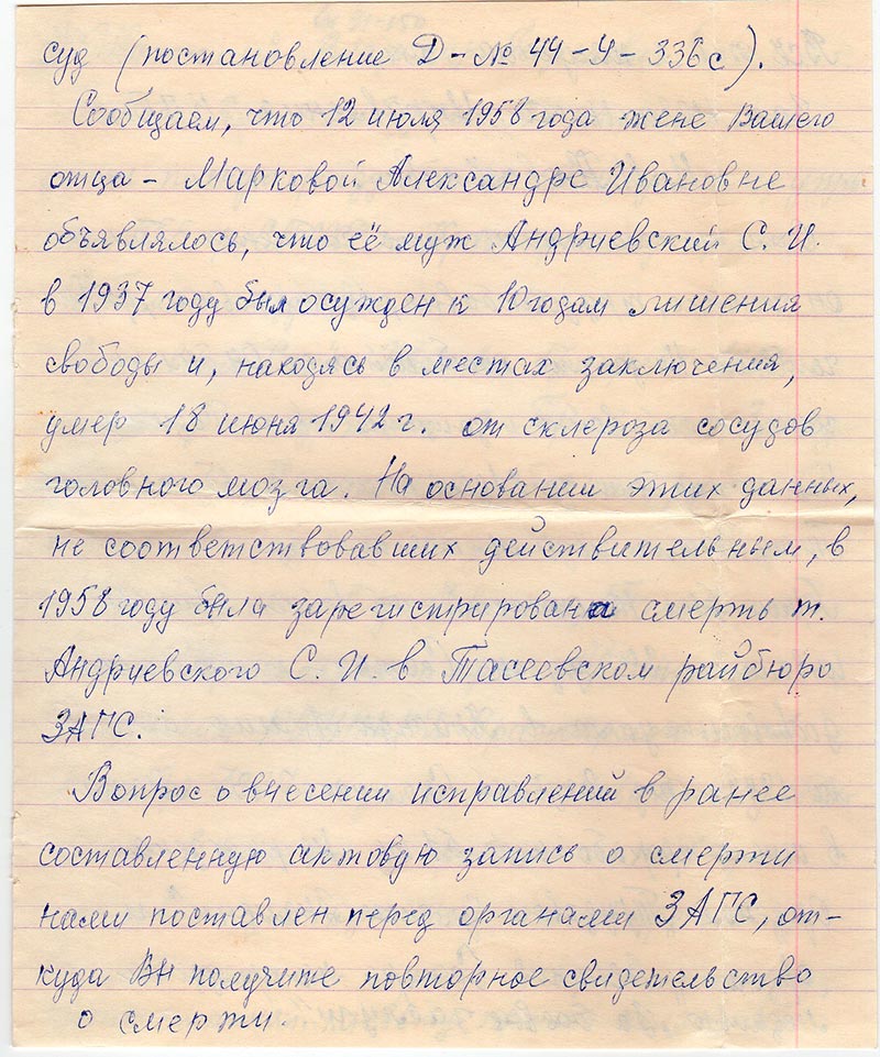 действительным, в 1958 году была зарегистрирована смерть т. Андриевского С. И. в