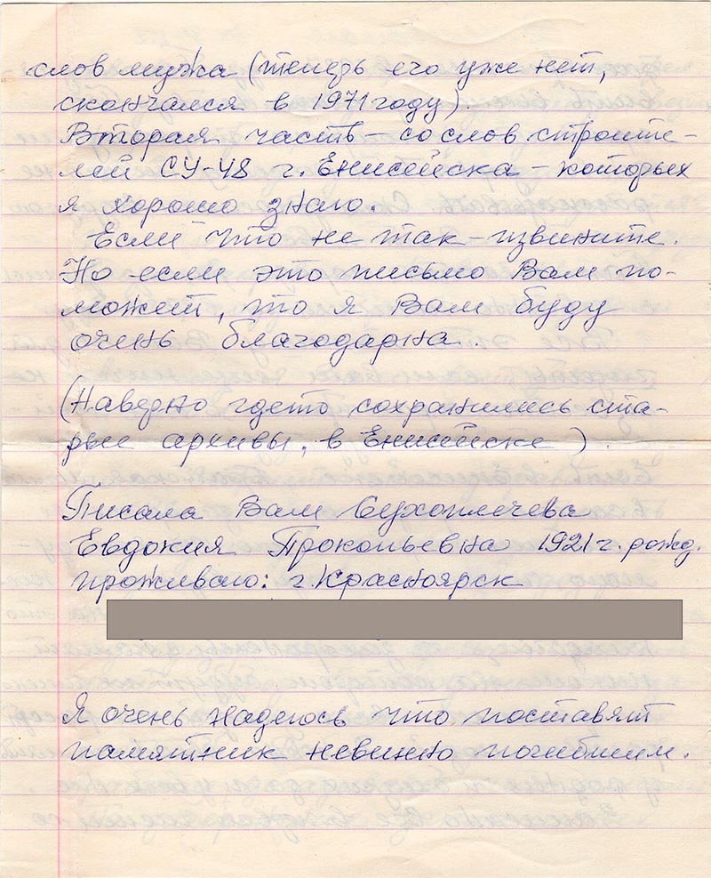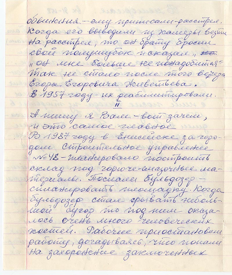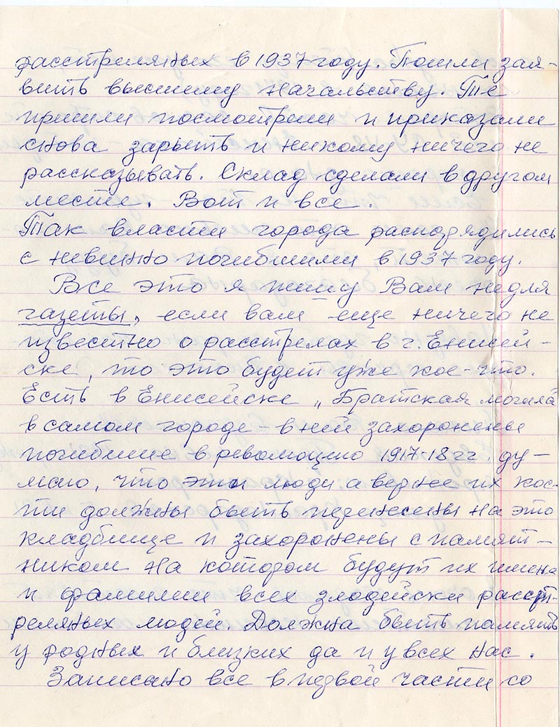 В 1987 году в Енисейске за городом Строительное управление №48 – планировало построить склад по горюче-смазочные материалы. Послали бульдозер – спланировать площадку. Когда бульдозер стал срывать небольшой бугор то под ним оказалось очень много человеческих костей. Рабочие приостановили работу, догадываясь, что попали на захоронение заключенных, расстрелянных в 1937 году. Пошли заявить высшему начальству. Те пришли посмотреть и приказали снова зарыть и никому ничего не рассказывать. Склад сделали в другом месте. Вот и все.
