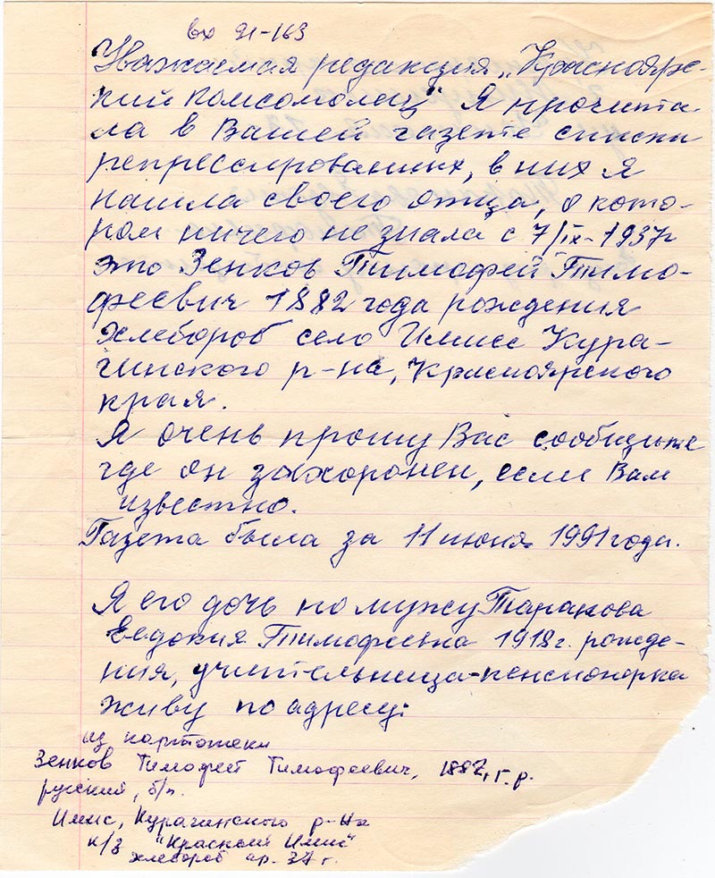 Уважаемая редакция «Красноярский комсомолец». Я прочитала в Вашей газете списки репрессированных, в них я нашла своего отца, о котором ничего не знала с 7/IX-1937 г. Это Зенков Тимофей Тимофеевич 1882 года рождения хлебороб село Имисс Курагинского р-на, Красноярского края.