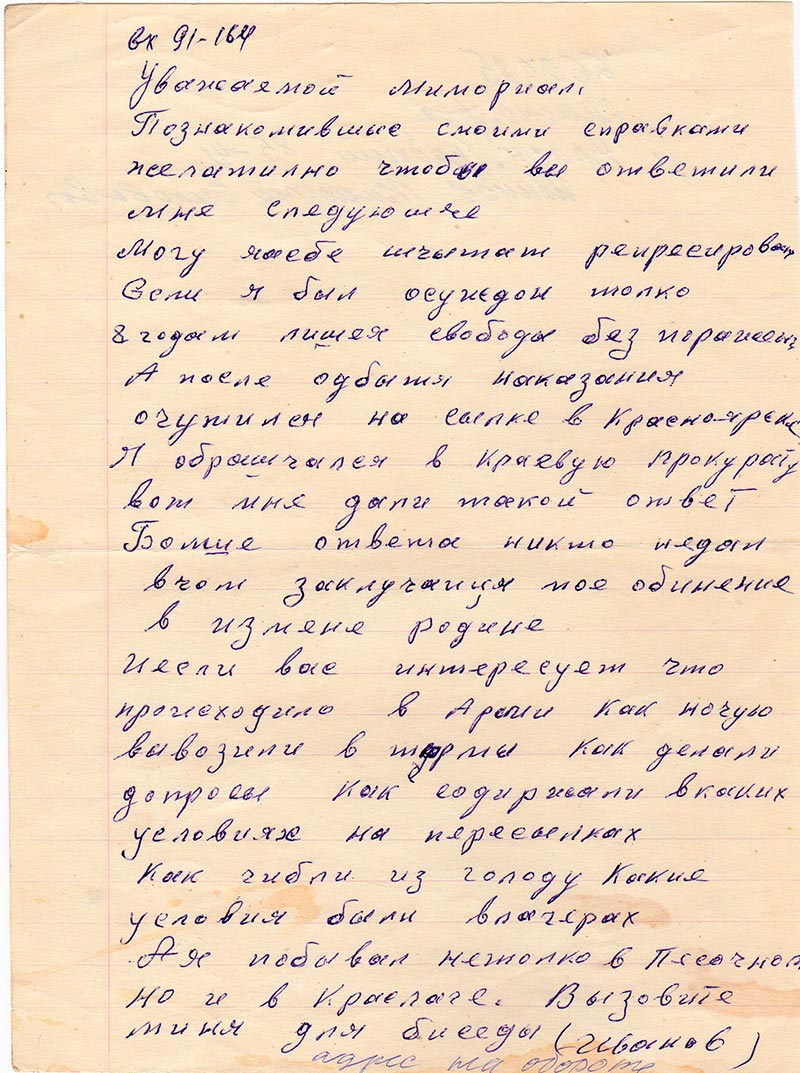 Могу я себе шчытат репресирован если я был осужлон толко 8 годам лишея свободы без поражении. А после одбытя наказания очутилен на сылке в Красноярск. Я обрашчался в Краевую прокурату вот мне дали такой ответ. Болше ответа никто недал вчом заклучаися мое обинение в измене родине