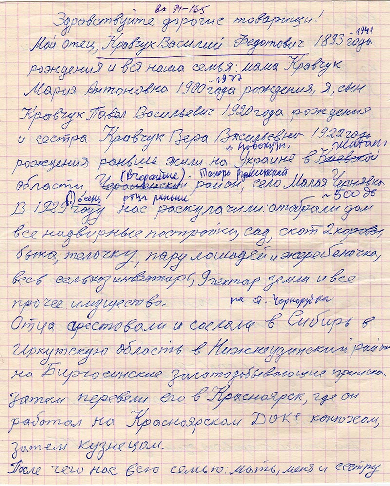Мой отец, Кравчук Василий Федотович 1893-1941 годы рождения и вся наша семья: мама Кравчук Мария Антоновна 1900-1977 года рождения, я, сын Кравчук Павел Васильевич 1920 года рождения и сестра Крав-чук Варе Васильевна 1922 года рождения (комментарий: в Новокузн.) на Украине в Киевской (комментарий: Житом.) области, Черашенский район (комментарий: теперь Ружинский), село Малая Чернявка ~ 5001дв.