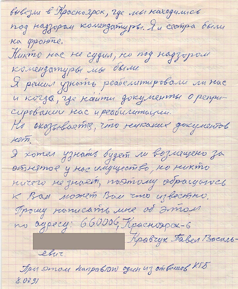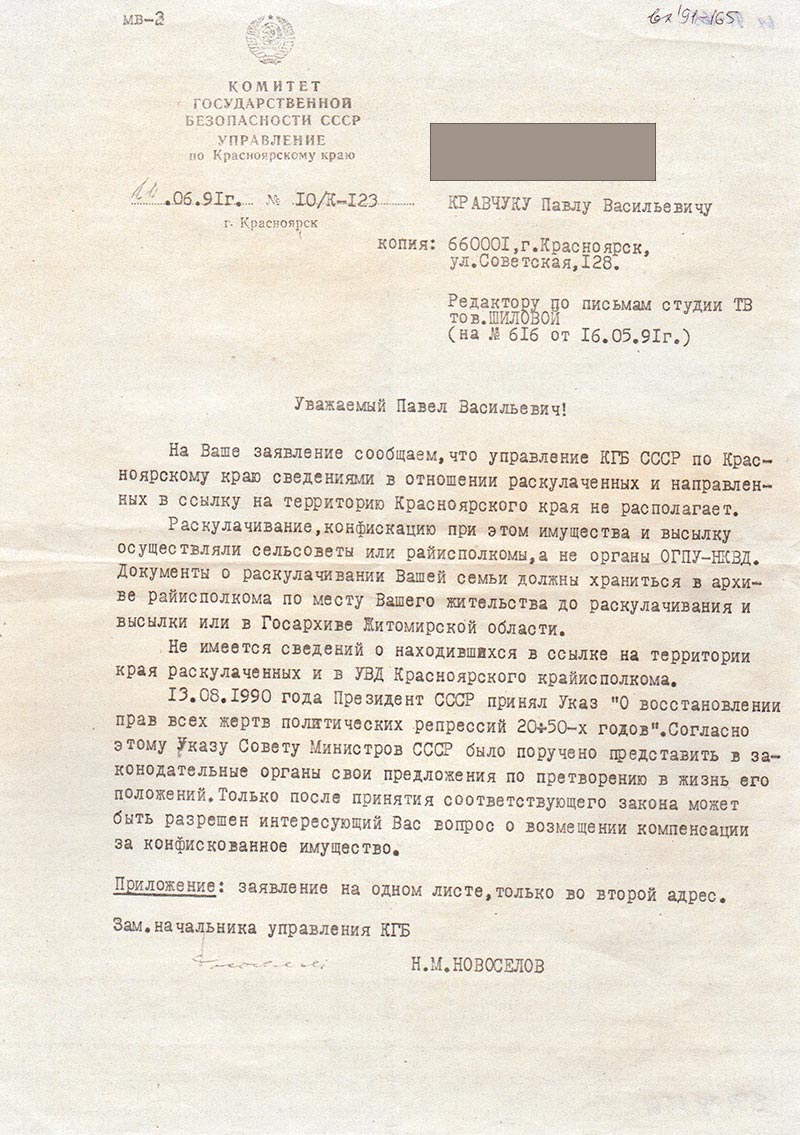 На Ваше заявление сообщаем, что управление КГБ СССР по Красноярскому краю сведениями в отношении раскулаченных и направленных в ссылку на территорию Красноярского края не располагает.