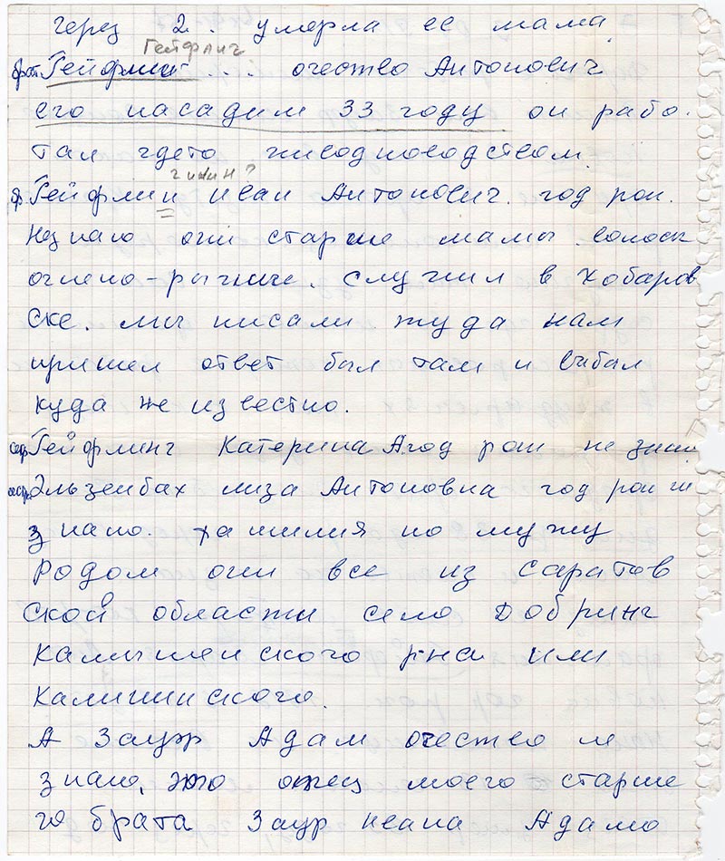 бр. Гейфлин (пометка карандашом: г или н?) Иван Антонович год рож не знаю они старше мамы. Волосы огнено-рыжие. Служил в Хобаровске. Мы писали туда нам пришел ответ был там и выбыл куда не известно.