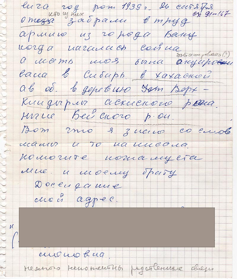 Пишет вам Зауэр Милия Соломоновна. Я пишу вам, по такой причине я прочла газету Красноярский комсомолец, которую получаю. Там узнала ваш адрес где вы пишите фамилии репресированных, которые работали в труд армиях, так как ищу фамилии своих дедек и также сродного брата Эльзенбах Владимир 38 года рож. город Баку. Месяц и очество его не знаю. Пишу со слов матери которой фамилия Гейфлиг (пометка карандашом: Гейфлинг) Мария Антоновна год рож. 1918 6 августа. Ныне покойница.