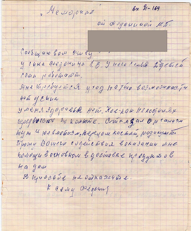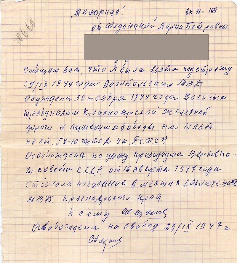 Сообщаю Вам, что я была взята под стражу 29/IX 1944 года Боготольским МВД.