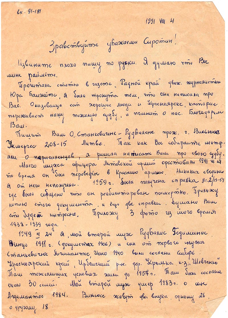 1949 III 24 я, мой второй муж Рудвалис Гедиминас Винцо 1911 г. (документах 1906) и сын от первого мужа Станкевичюс Алгимантас Ионо 1040 были сосланы Сибирь Красноярский край, Ирбейский р-н дер. Кромка к-з «Шевченко». Там тежелейших условях жили до 1957 г. Там была сослана около 30 семей. Мой второй муж умер 1983 г. о сын Алгимантас 1984. Вильнюсе живут два внука, однаму 26, о другому 18.