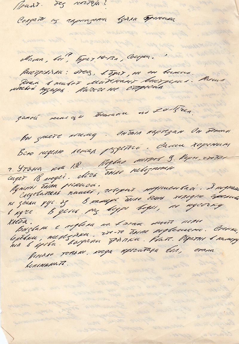 Ночью 14 декабря 1944 года приехали военные, окружили дом. Вывели отца и расстреляли. Он не сопротивлялся, его последние слова были: «Ребята, что вы делаете». Кто-то из соседей пытался убежать, по ним тоже стреляли. Все готовы уже были к расстрелу. КК одела красивое черное платье, в нем было 16 клиньев и все они были объметаны белыми нитками. Мама посадила маленького брата (5 лет) на печьку и забыла об этом. Когда КК одевала платье рядьником ходил маленький русский солдат и говорил, что очень жаль маленькую хозяйку. Она немного понимала по…