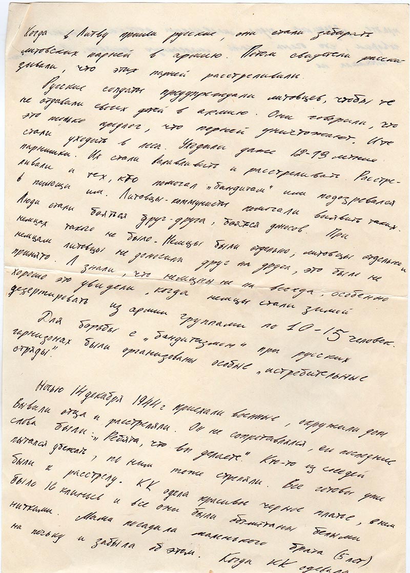 Русские солдаты предупреждали литовцев, чтобы те не отдавали своих детей в армию. Они говорили, что это только предлог, что парней уничтожают. И те стали уходить в лес. Уходили даже 12-13 летние парнишки. Их стали вылавливать и расстреливать. Расстрел в помощи им. Литовцы-коммунисты помогали выявить таких. Люди стали бояться друг друга, бояться доносов. При немцах такого не было. Немцы были отдельно, литовцы отдельно и принято. Л знали, что немцы не на всегда, особенно хорошо это увидели, когда немцы стали зимой дезертировать из армии группами по 10-15 человек.