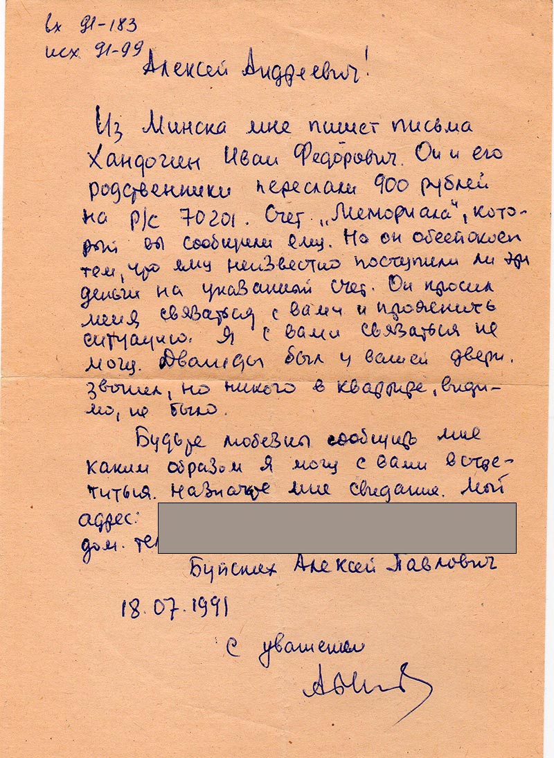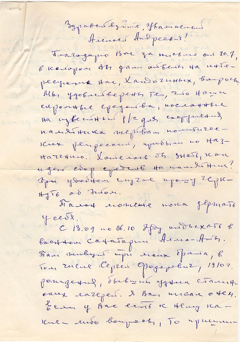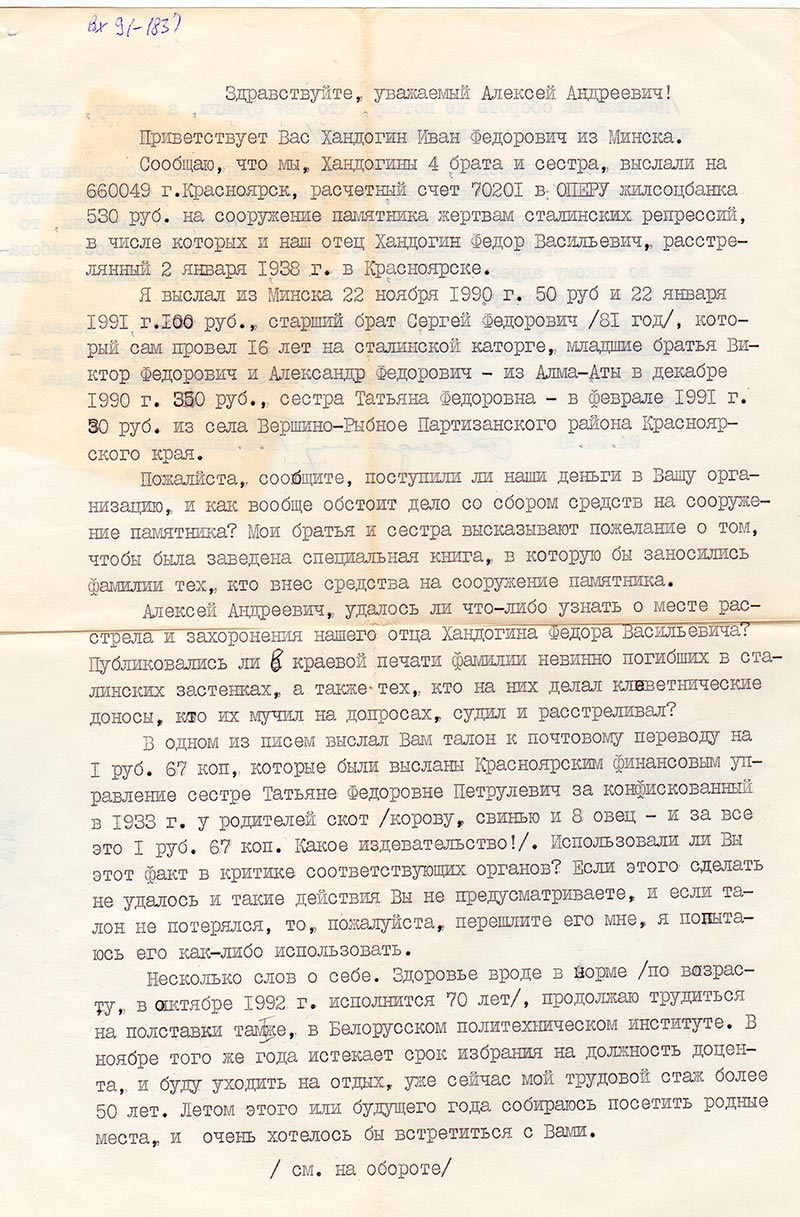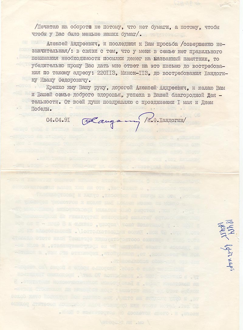 Алексей Андреевич, и последняя к Вам просьба /совершенно незначительная/: в связи с тем, что у меня в семье нет правильного понимания необходимости посылки денег на названный памятник, то убедительно прошу Вас дать мне ответ на это письма до востребования по такому адресу: 220113, Минск-113, до востребования Хандогину Ивану Федоровичу.