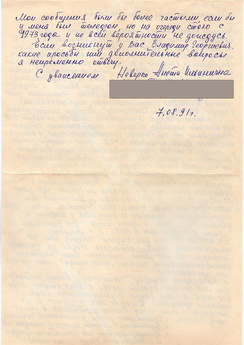 Получила Ваше письмо и выполняю Вашу просьбу: высылаю копию документа, высланного органами КГБ на моего отца Неверко Ильи Алексеевича. Кроме этого еще из Новосибирска высылаю справку о его реабилитации и свидетельство о смерти из Ужура, но уже с исправленными данными. 21 декабря 1937 года были арестованы 6 человек наших родственников. Когда я была на учредительном собрании общества «Мемориал» в музее Ленина, я представили всех пофамильно и имя, отчество. Некоторые уже прошли в списках репрессированных, опубликованные в газете «Красноярский Комсомолец», вырезки, которые храню.