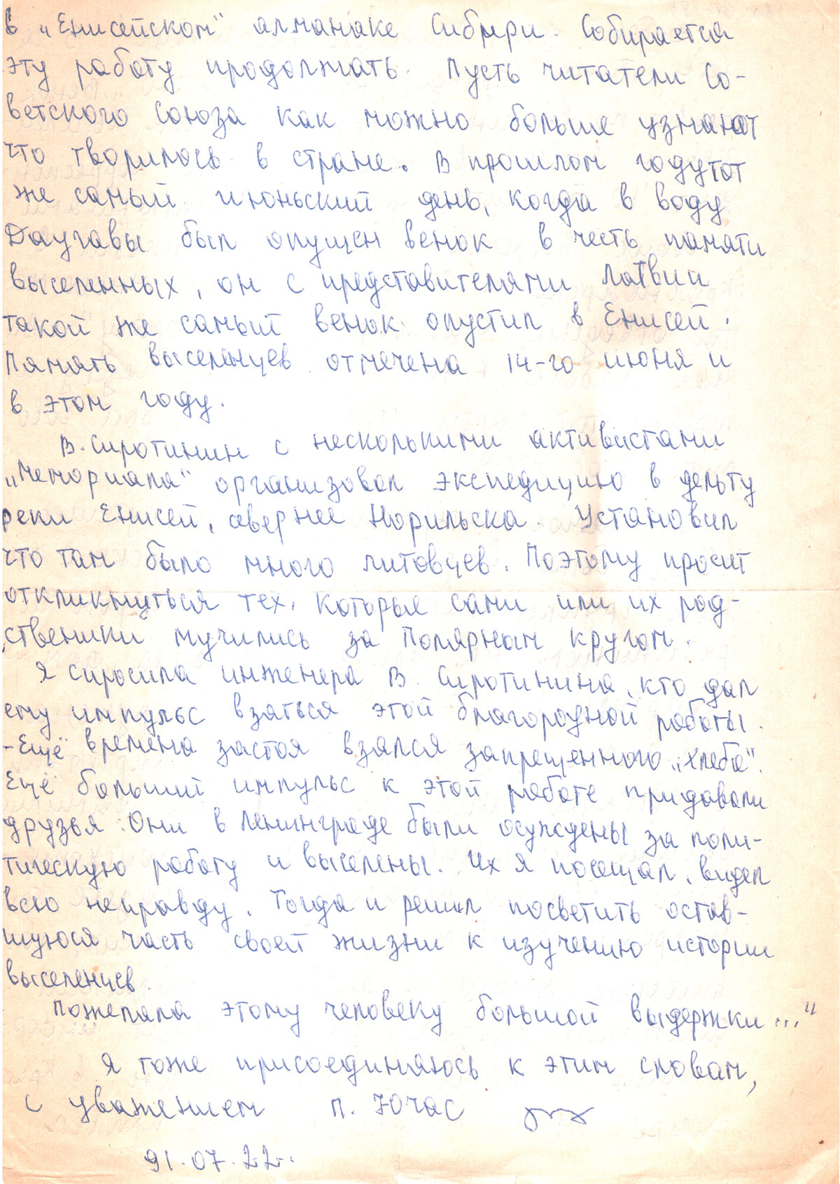 «. . . Самое интересное в мое(й) путешествии было встреча в Красноярске с членом группы «Мемориал» Владимиром Сиротинином на улице Робес(т)пьера, дом ..., квартира .... Его квартира загружена книгами, газетами, 7000-я картотека, в которую заносятся все новые фамилии бывших выселенцев, места их происхождения. Списки печатаются в газете «Красноярский комсомолец». Среди русских, латвийских много и литовских фамилий. Сиротинин сказал, что он ждет информации о каждом заключенном в Краслагере. Много материала он привел в «Енисейском» (алманаке) Сибири. Собирается эту работу продолжать. Пусть читатели Советского Союза как можно больше узнают что творилось в стране. В прошлом году тот же самый июньский день, когда в воду Даугавы был опущен венок в честь памяти выселенных, он с представителями Латвии такой же самый венок опустил в Енисей.