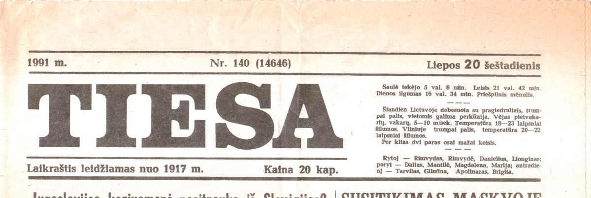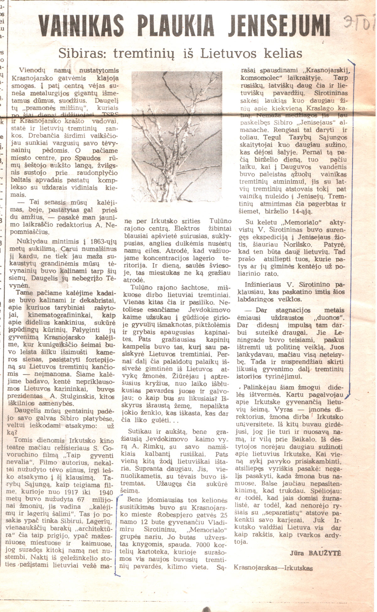 Добрый день, Владимир Георгиевич! В газете «Тиеса» (Правда) нашел статью «Венок плывет по Енисею. Сибирь: по дорогам выселенцев и(з) Литвы», в которой наш корреспондент Ю. Баужите делится впечатлениями о своих встречах с соотечественниками в Красноярске и Иркутске. В ней много места отведено Красноярскому «Мемориалу» и Вашей работе в нем. Высылаю газету и перевод той части статьи, в которой говорится об этом.