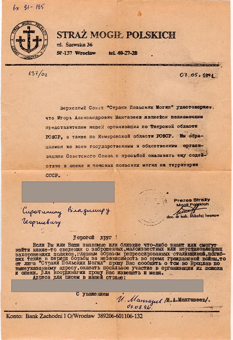 Верховный Совет «Стражи Польских Могил» удостоверяет, что Игорь Александрович Мангазеев является полномочным представителем нашей организации по Тверской области РСФСР, а также по Кемеровской области РСФСР. Мы обращаемся ко всем государственным и общественным организациям Советского Союза с просьбой оказывать ему содействие в опеке и поисках польских могил на территории СССР.