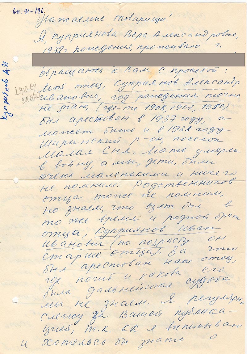 Я, Куприянова Вера Александровна, 1932 г. рождения, проживаю ---адрес--- обращаюсь к Вам с просьбой: мой отец, Куприянов Александр Иванович, год рождения точно не знаю (где-то 1908, 1907, 1910) был арестован в 1937 году, а может быть и в 1938 году Ширинский район поселок Малая Сыя. Мать умерла в войну, а мы, дети, были очень маленькими и ничего не помним. Родственников отца тоже не помним, но знаем, что взят был в то же время и родной брат отца, Куприянов Иван Иванович (по возрасту он старше отца). За что был арестован наш отец, где погиб и какова его была дальнейшая судьба мы не знаем. Я регулярно слежу за Вашей публикацией, т.к. КК я выписываю и хотелось бы знать о судьбе отца. Или на страницах газеты сообщите, или письменно. Как Вам угодно.