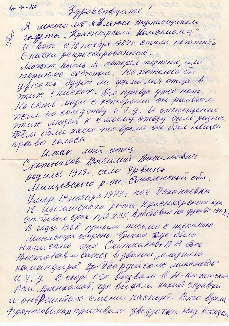 Я много лет являюсь подписчиком газеты «Красноярский Комсомолец». И вот с 18 ноября 1989 г. стали печатать списки репрессированных. Может быть я потерял терпенье, или тороплю событие. Но хотелось бы узнать будет ли фамилия отца в этих списках. Его правда уже нет. Но есть люди с которыми он работал жил по соседству и т.д. и отношение этих людей к моему отцу было разное. Тем более какое-то время он был лещен право голоса.
