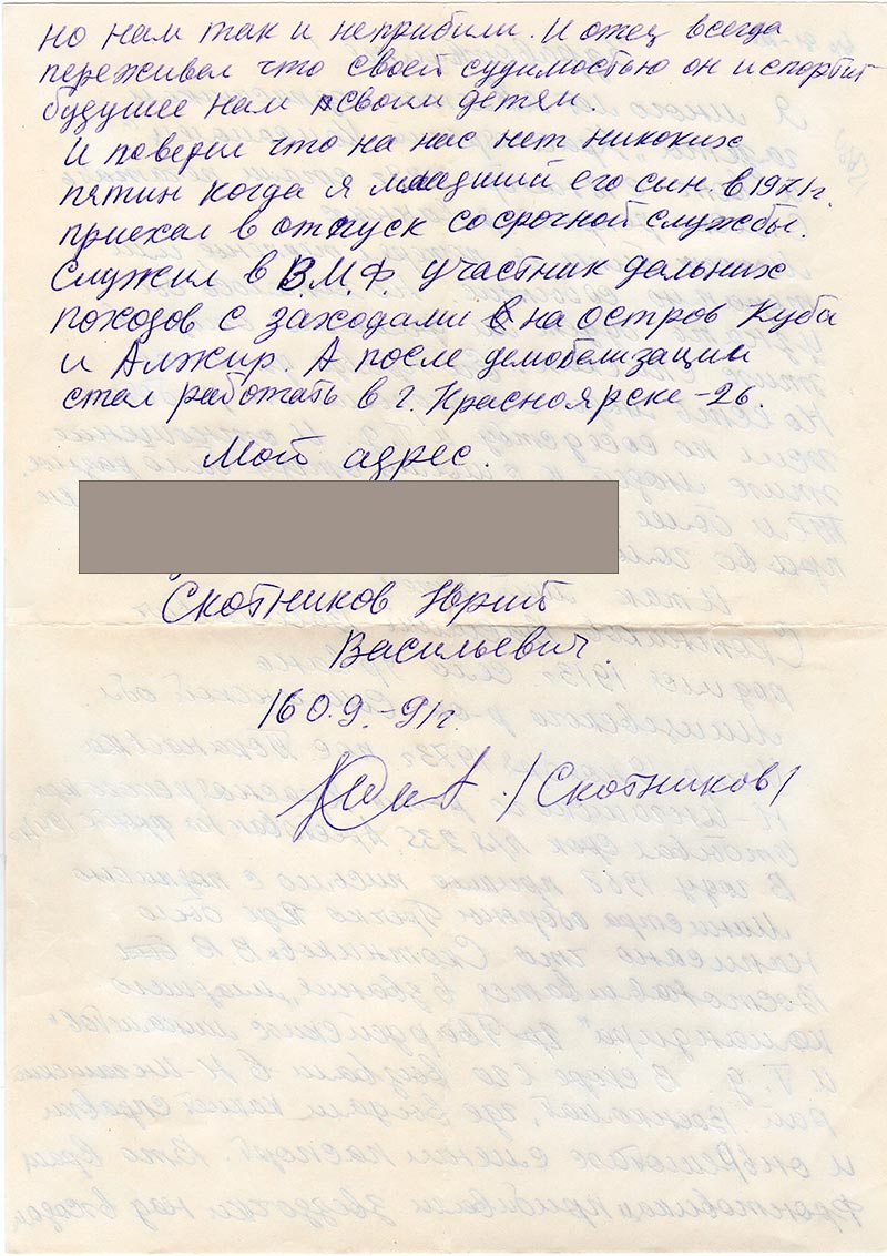 И поверил что на нас нет никаких пятен когда я младший его сын в 1971 г. приехал в отпуск со срочной службы. Служил в ВМФ участник дальних походов с заходами на остров Куба и Алжир. А после демобилизации стал работать в г. Красноярске-26.