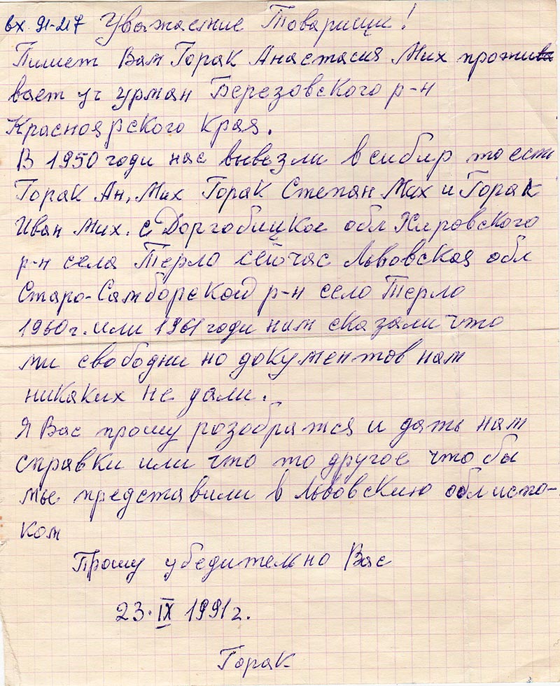 В 1950 годи нас вывезли в сибир то есть Горак Ан. Мих Горак Степан Михайлович и Горак Иван Миайлович.