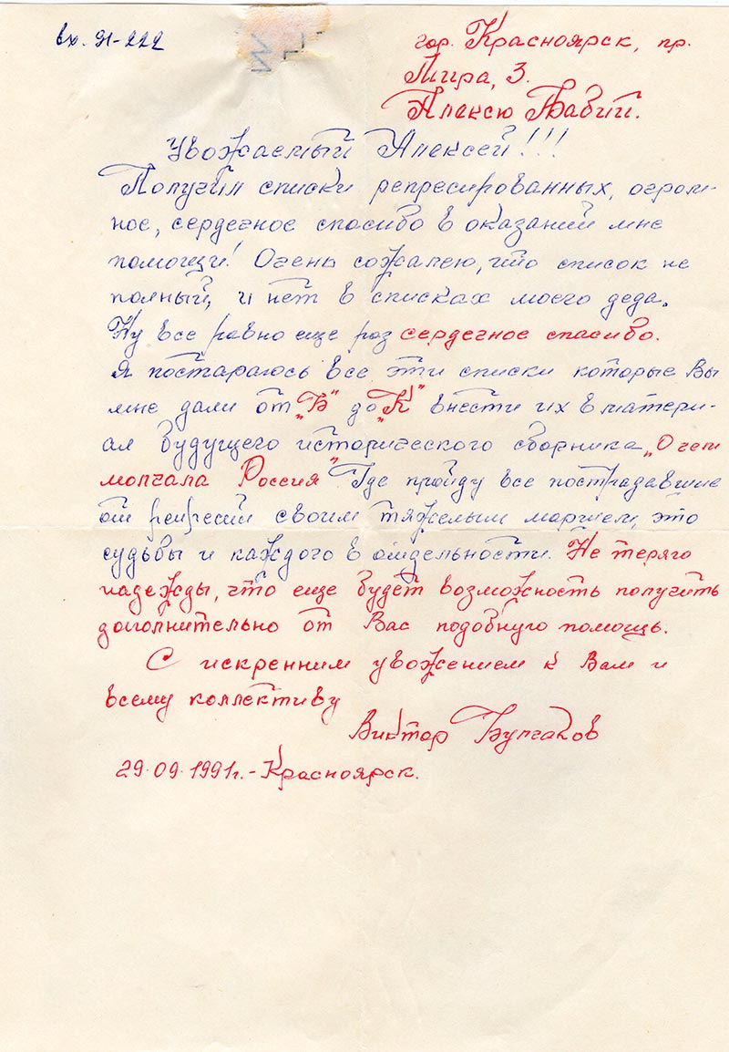 Я постараюсь все эти списки которые Вы мне дали от «Б» до «К» внести их в материал будущего исторического сборника «О чем молчала Россия». Где пройду все пострадавшие от репресий своим тяжелым маршем, это судьбы и каждого в отдельности. Не теряю надежды, что еще будет возможность получить дополнительно от Вас подобную помощь.