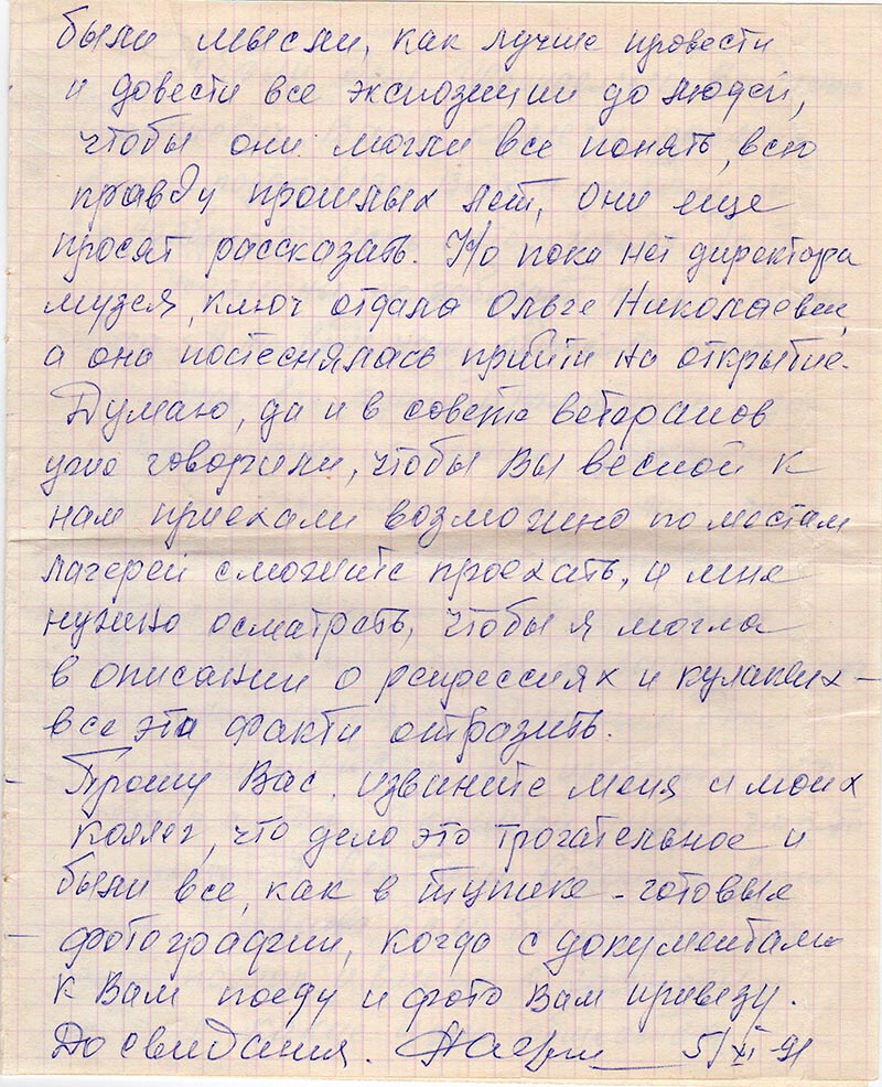 Думаю, да и в совете ветеранов уже говорили, чтобы Вы весной к нам приехали возможно по местам лагерей сможите проехать, и мне нужно осматреть, чтобы я могла в описании о репрессиях и кулаках – все эти факты отразить.