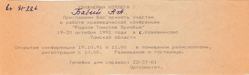 Приглашаем Вас принять участие в работе краеведческой конференции «Родное Томское Приобье» 19-20 октября 1991 года в с .Кожевниково Томской области.
