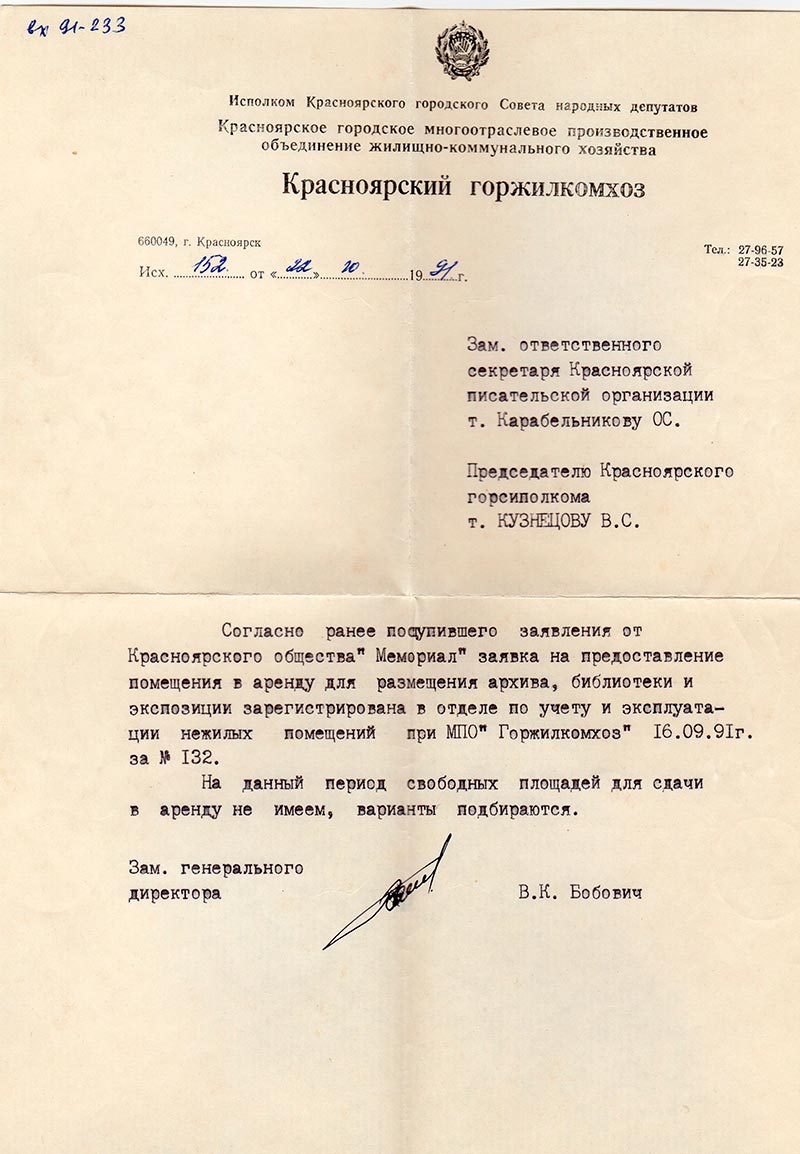 Согласно ранее поступившего заявления от Красноярского общества «Мемориал»
