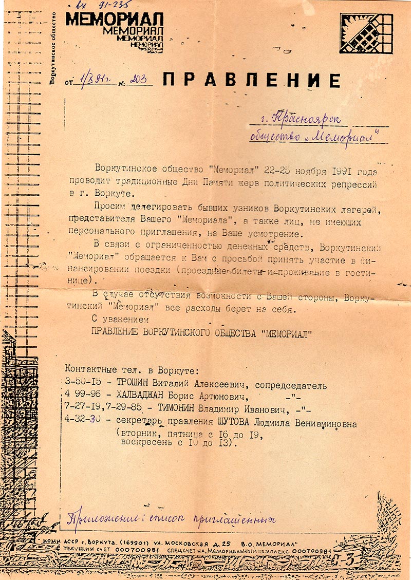 Просим делегировать бывших узников Воркутинских лагерей, представителя Вашего «Мемориал», а также лиц, не имеющих персонального приглашения, на Ваше усмотрение.