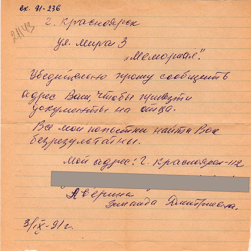 Убедительно прошу сообщить адрес Ваш, чтобы привезти документы на отца. Все мои попытки найти Вас безрезультатны. Мой адрес: Аверина Зинаида Дмитриевна 3/IX-91 г.
