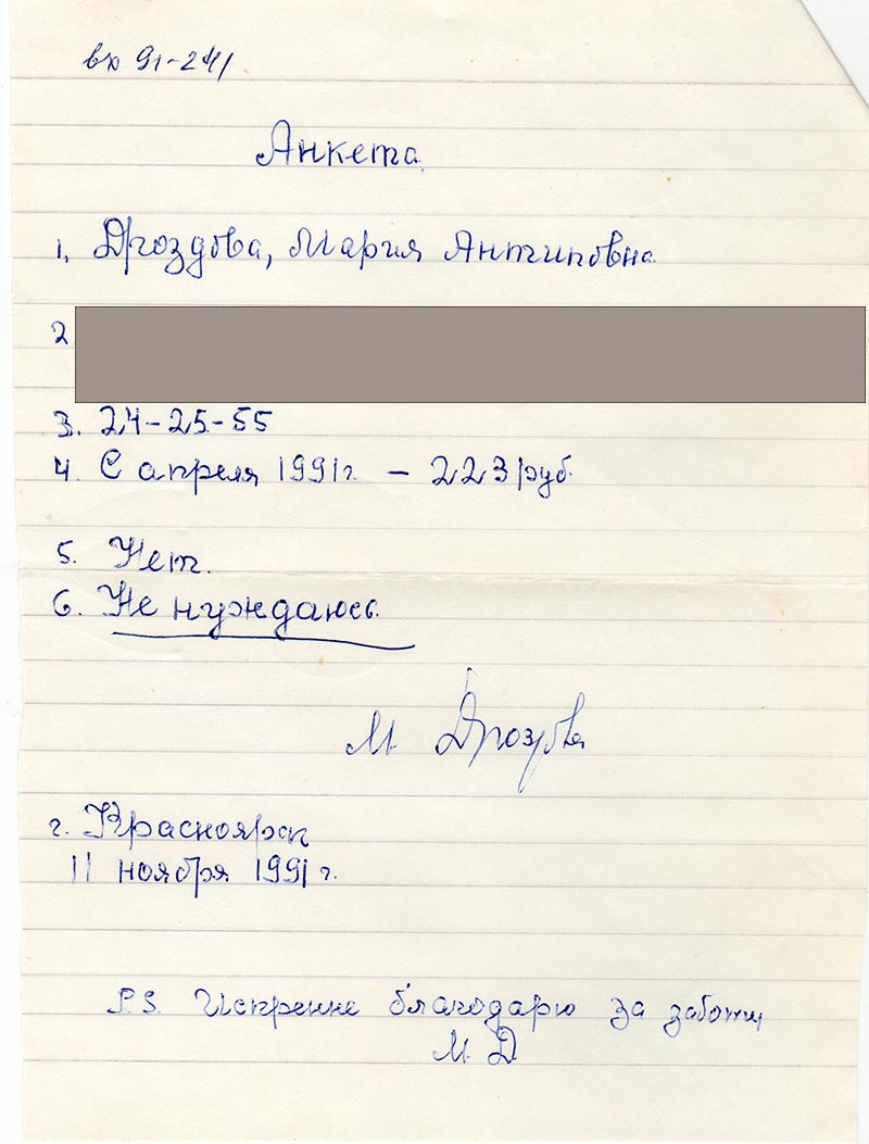 Анкета 1. Дроздова, Мария Антиповна 2. 3. 4. С апреля 1991 г. – 223 руб 5. Нет 6. Не нуждаюсь М Дроздова г. Красноярск 11 ноября 1991 г. P.S. Искренне благодарю за заботу М.Д.