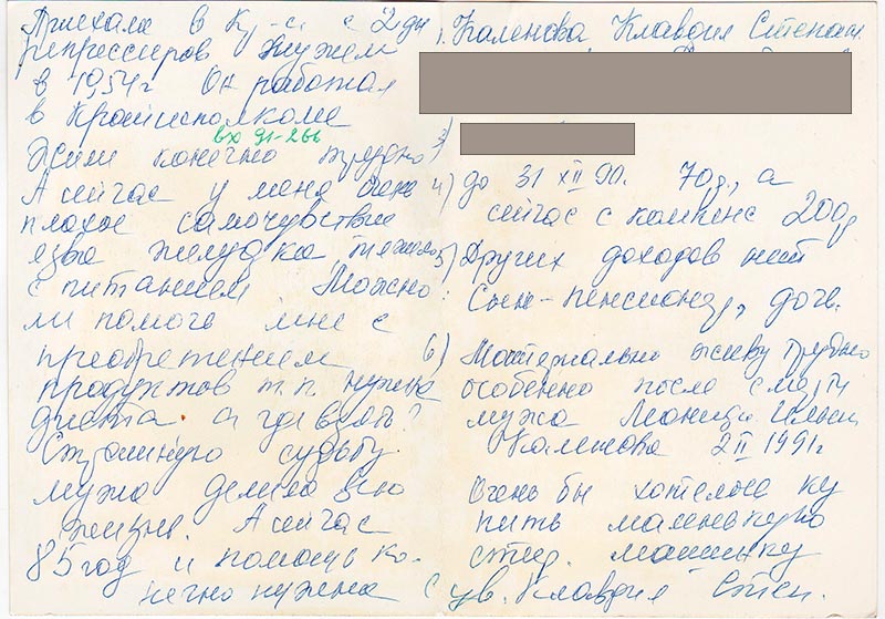 Приехала в Кр-с с 2дн репрессиров мужем в 1954 г. Он работал в Крайисполкоме. Жили конечно трудно. А сейчас у меня очень плохое самочувствие язва желудка тяжело с питанием. Можно ли помочь мне с преобретением продуктов т.п. нужна диета, а где взять? Страшную судьбу мужа делила всю жизнь. А сейчас 85 год и помощь конечно нужна.